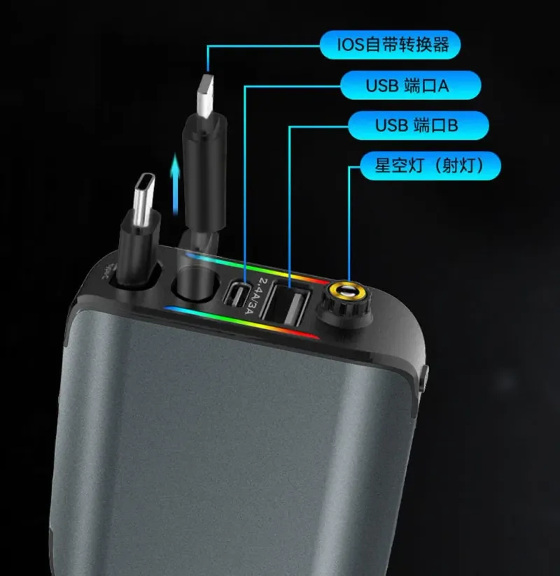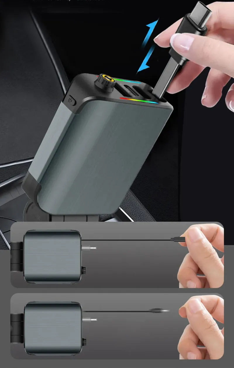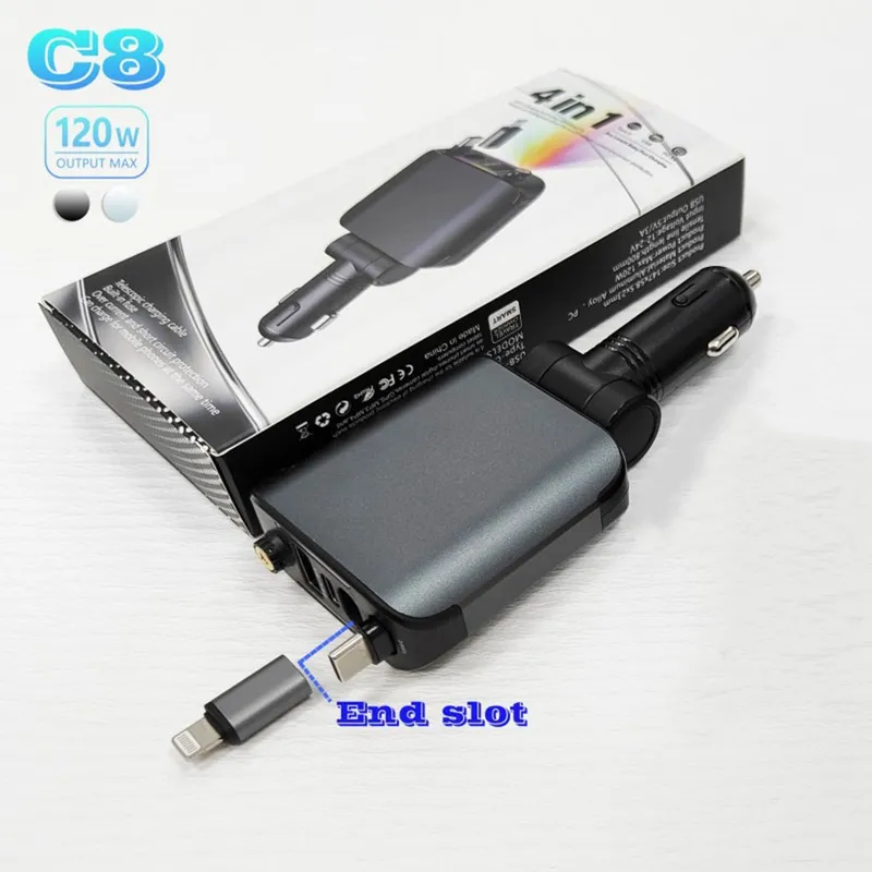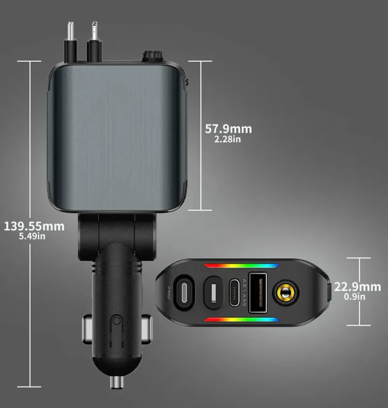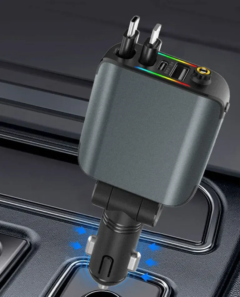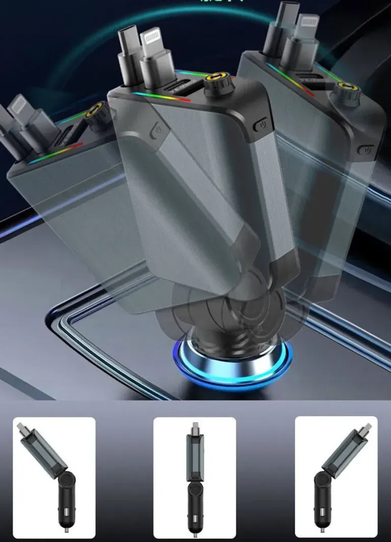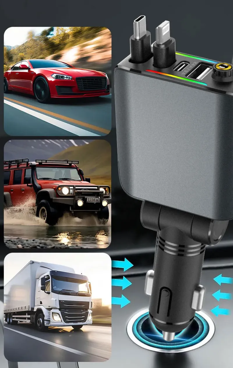 شاحن سيارة سريع بقدرة 120 واط، مزوّد بمنافذ USB وType-C لشحن هاتفين في آن واحد، متوافق مع أجهزة Android وiOS، يتميّز بتصميم أنيق وإضاءة LED عصرية تضيف لمسة فخمة داخل سيارتك.