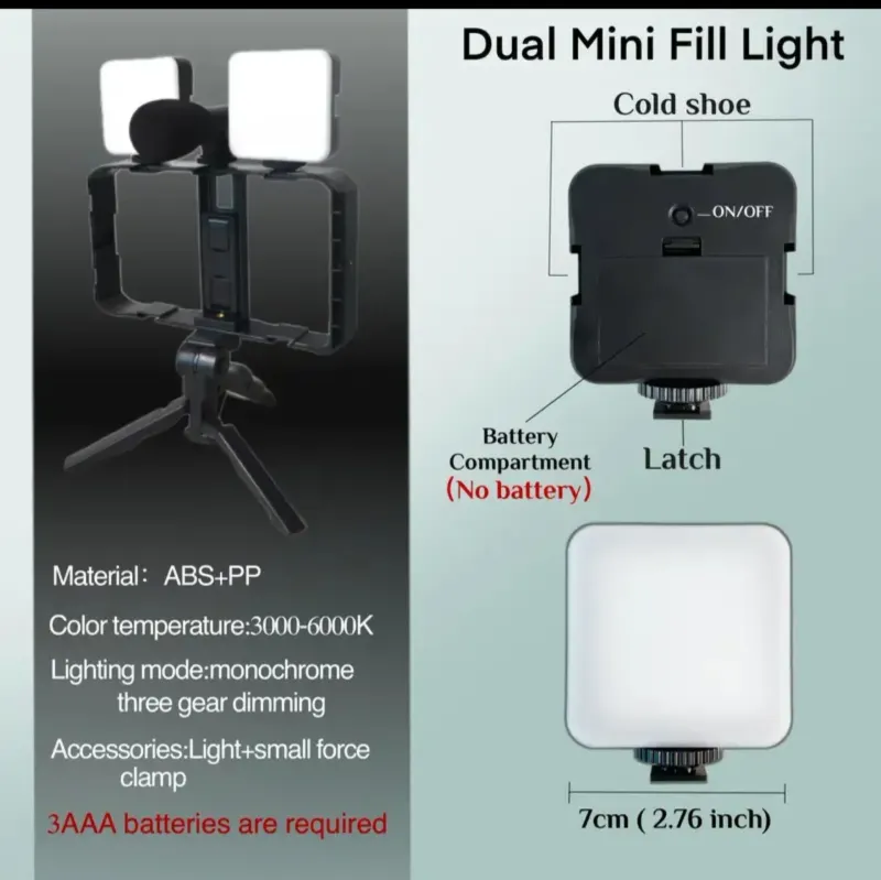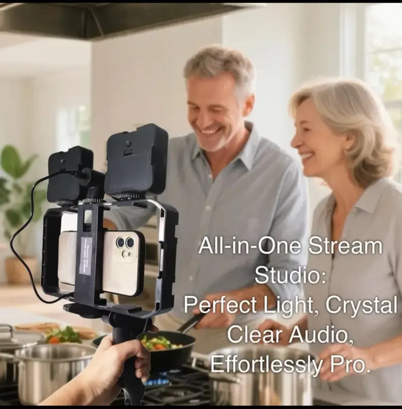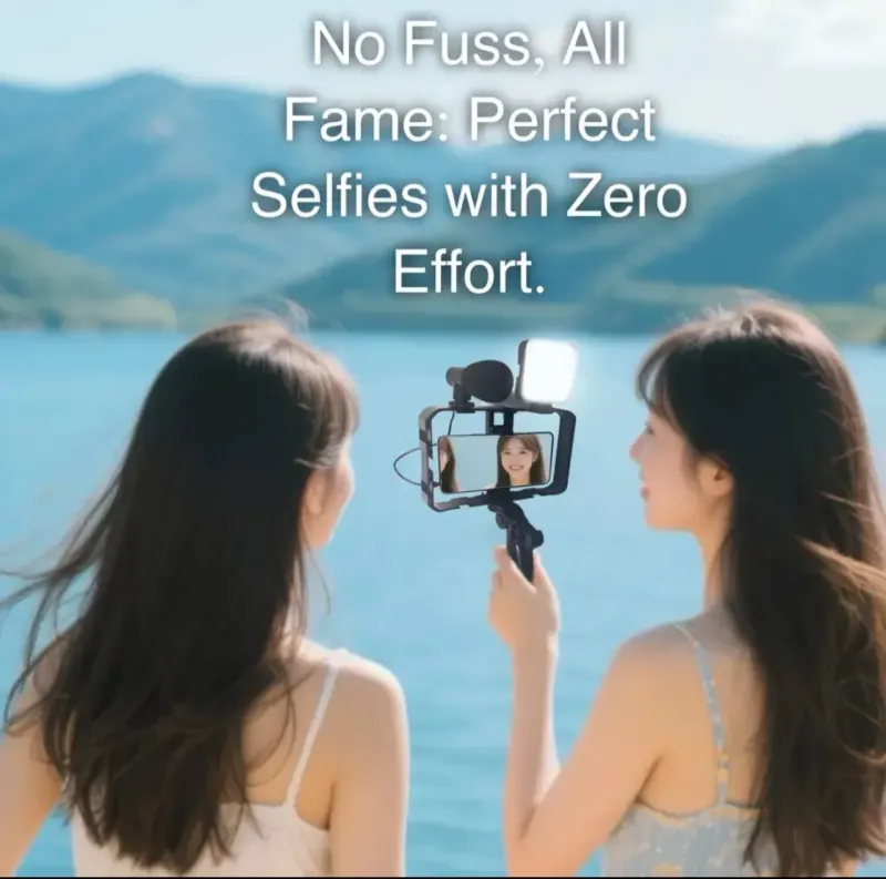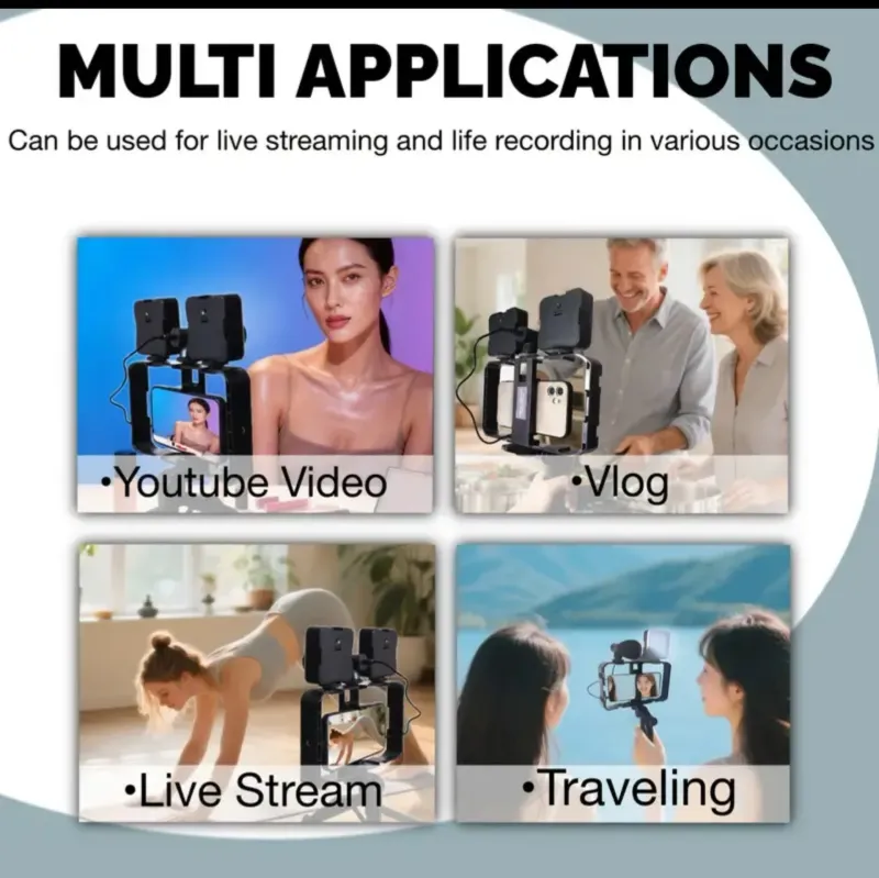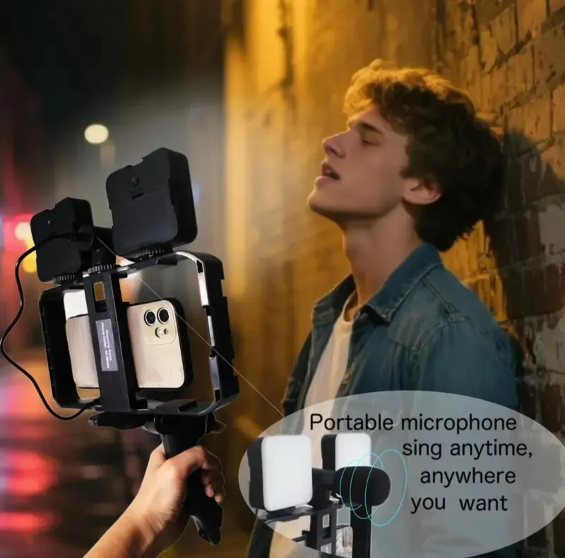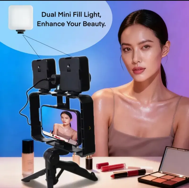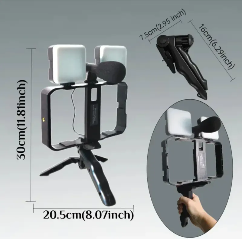 تم تجهيز الطقم بحامل هاتف قابل للتعديل يضمن ثباتًا كبيرًا أثناء التصوير، مع إمكانية حمله بيد واحدة أو تثبيته على ستاند للحصول على زوايا تصوير احترافية. وحدات الإضاءة المزدوجة تمنحك سطوعًا متوازنًا وتوزيعًا مثاليًا للضوء، لتظهر التفاصيل بوضوح حتى في البيئات منخفضة الإضاءة.