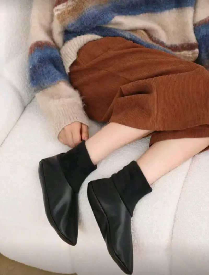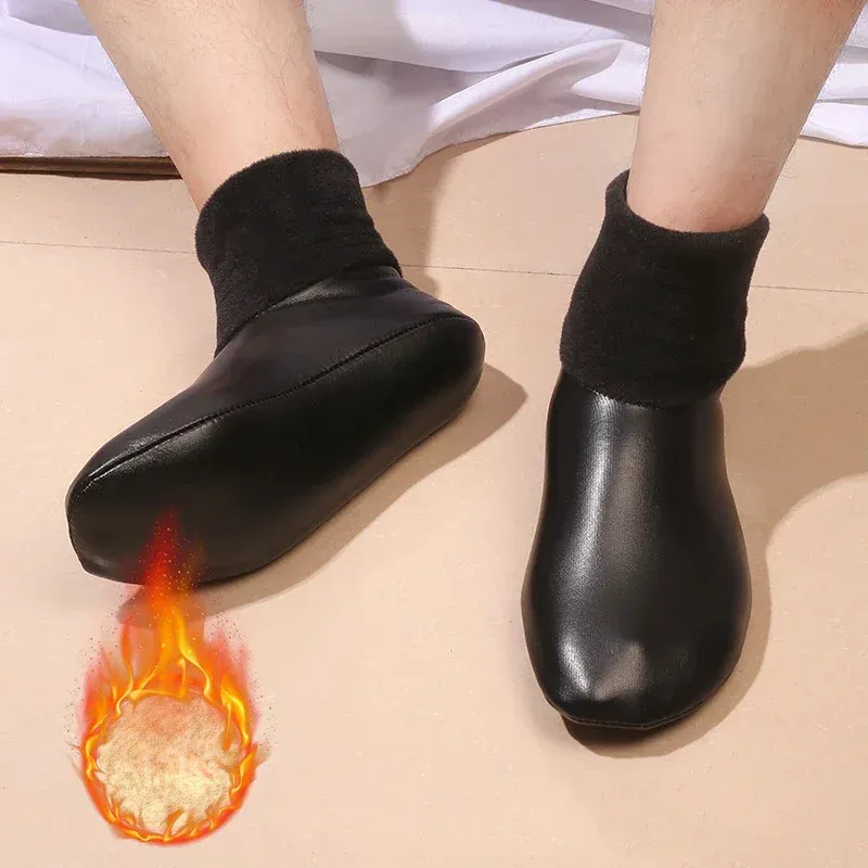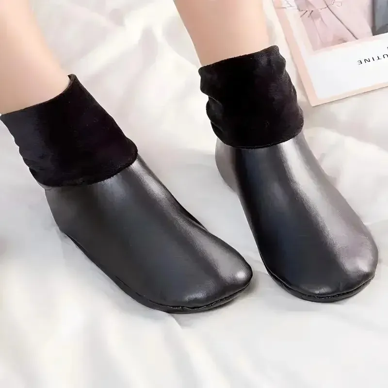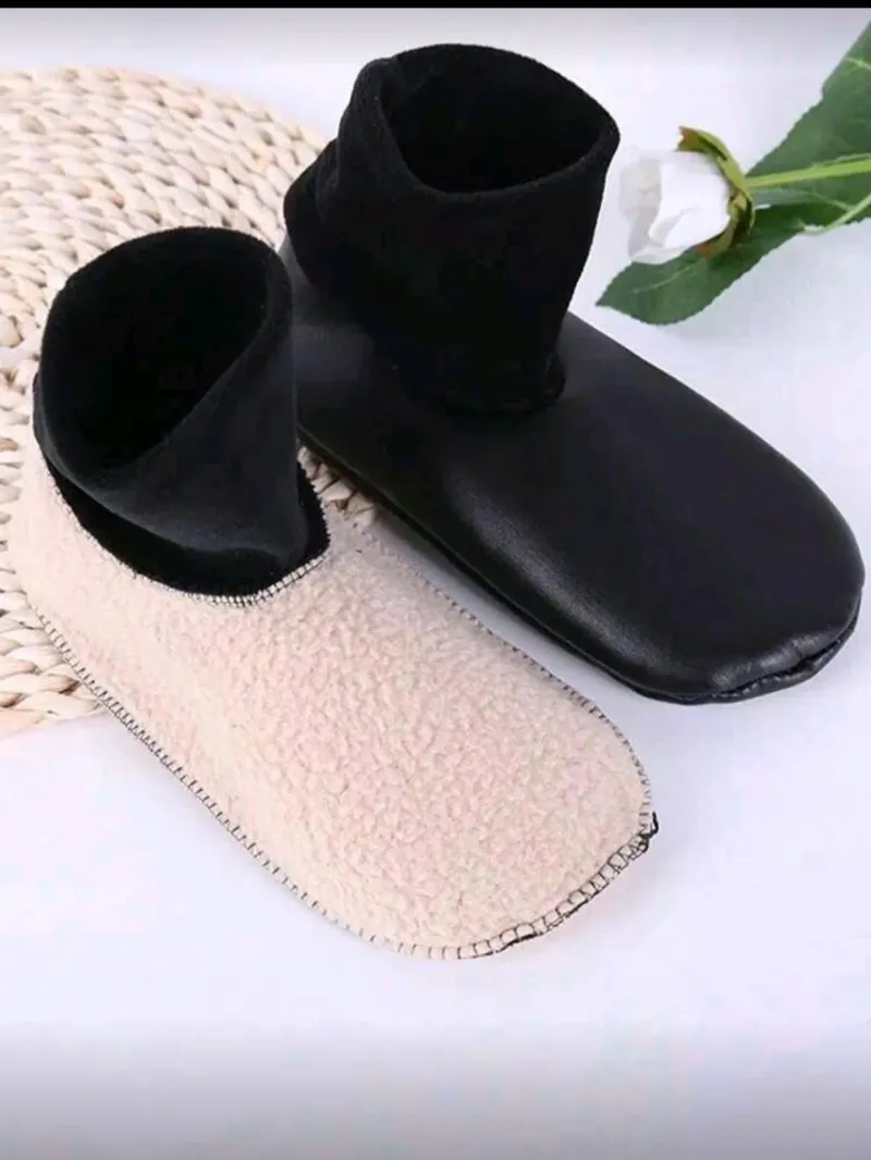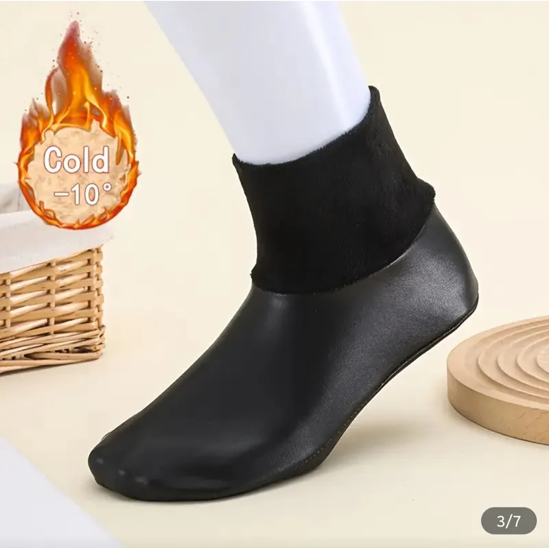 زوج من أحذية أو جوارب حرارية مقاومة للبرد، مصنوعة من الجلد الصناعي من الخارج ومبطنة من الداخل بقماش دافئ.