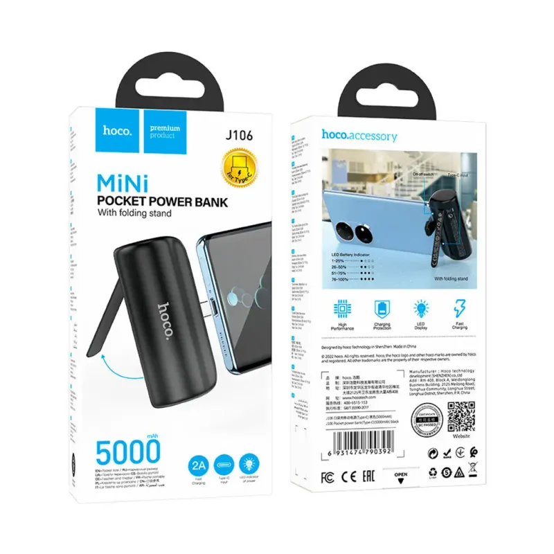 🔋 باوربانك HOCO J106 Mini – صغير في الحجم، قوي في الأداء! بطارية محمولة بسعة 5000mAh مع فيشة Type-C مدمجة للشحن المباشر بدون كابل، بالإضافة إلى حامل قابل للفتح يسمح لك بمشاهدة الفيديوهات أثناء الشحن. خفيف، أنيق، ومثالي للاستخدام اليومي والسفر.