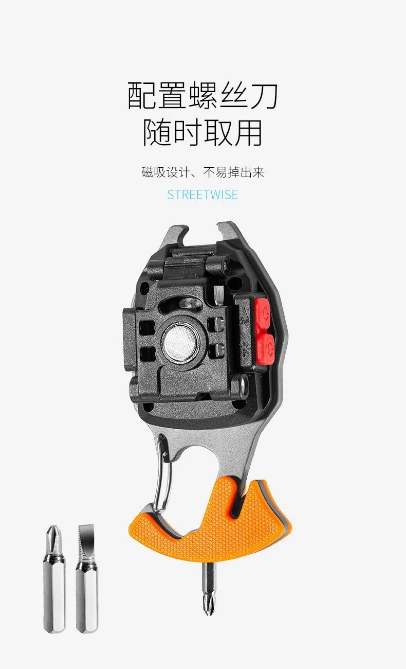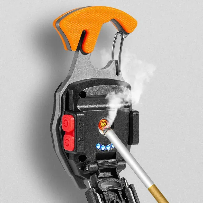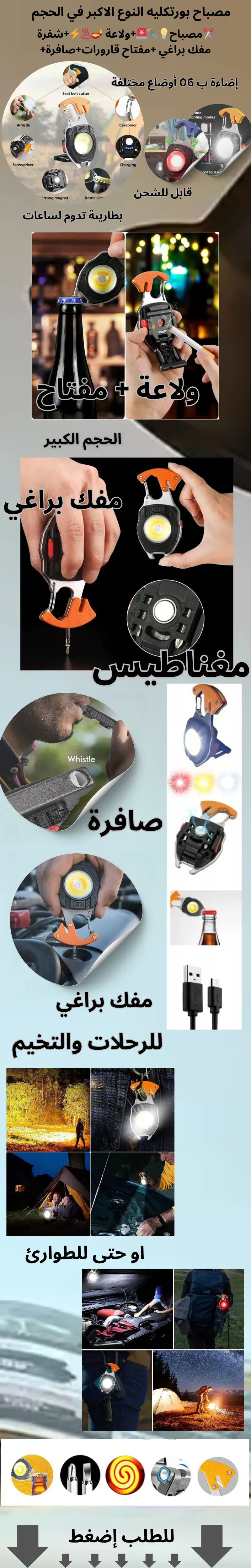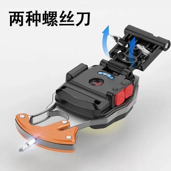 أداة صغيرة بحجم الجيب تجمع بين مصباح قوي+مفك براغي+ فتاحة قوارير +مغناطيس+ شفرة حادة. — رفيقك المثالي في التخييم، السيارة والطوارئ.